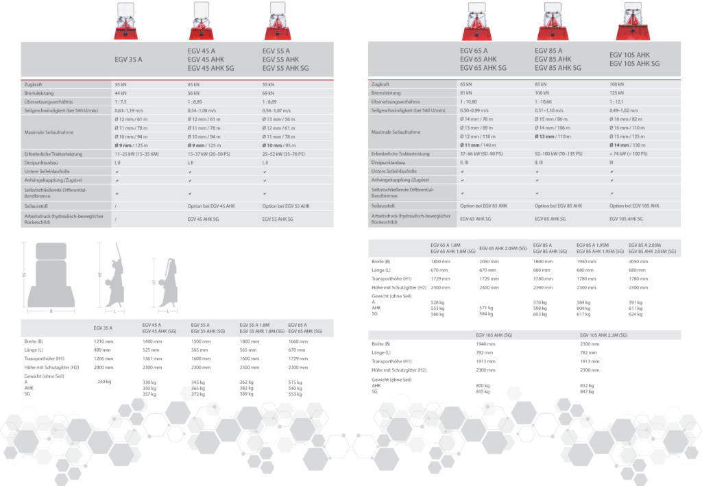 - Die Zugkraft der Winde muss zur Traktorleistung und -masse passen, ebenso zur Seillänge und -durchmesser.