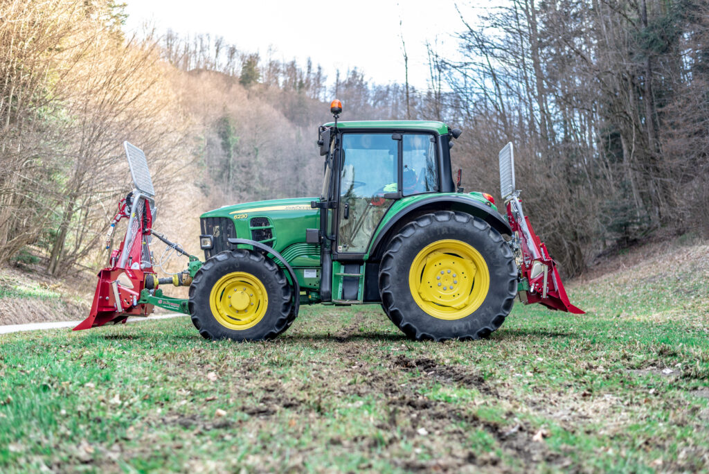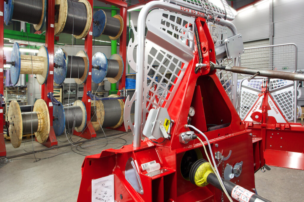 Control options include mechanical control (simple and most economical) or electrohydraulic control, which can later be upgraded with radio remote control. Advanced control systems become particularly useful when working more than two weeks per year. With mechanical or cable control, two operators are usually required, and communication errors can quickly lead to accidents. - Tractors between 35 and 70 HP are suitable for winches with approx. 55 kN pulling force. For lighter workloads, either mechanical or cable-controlled electrohydraulic winches are appropriate.